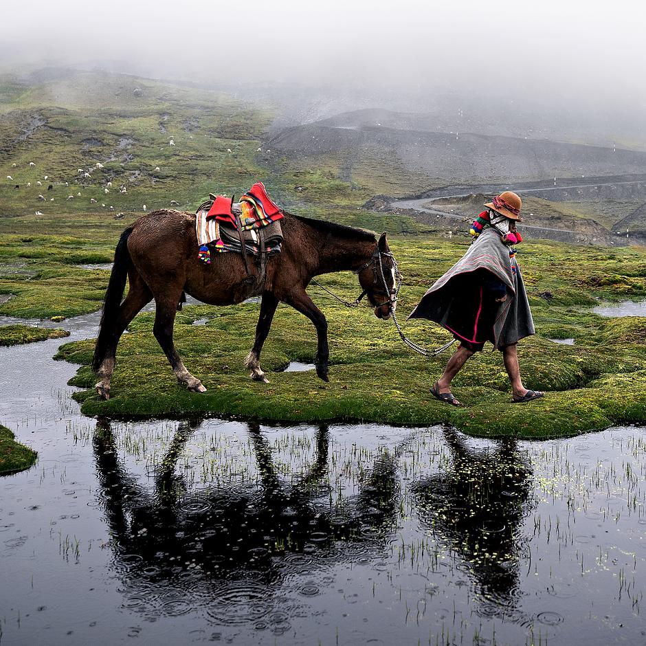 Homme q’ero, Pérou, 2022 – Les Q’ero vivent dans les vallées les plus reculées des Andes péruviennes, à des altitudes comprises entre 4000 et 6500 mètres. Les Q’ero affirment vivre en équilibre et dans le respect de tous les êtres vivants, grâce à l’ayni (réciprocité) qu’ils pratiquent avec les individus, leur famille, leurs voisins et leur communauté. Ce principe repose sur l’idée de toujours donner, sachant que, au final, on recevra soi-même en retour.