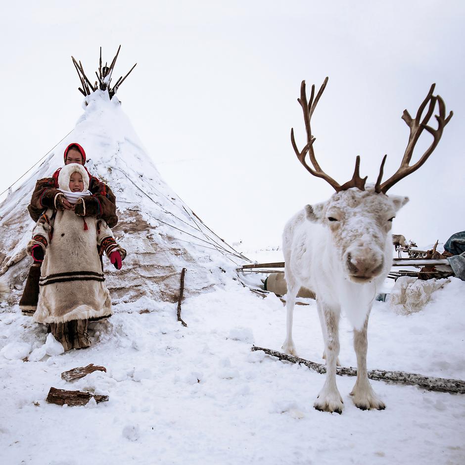 Campement nenets, Russie, 2018 – Les Nenets vivent dans les étendues gelées de la péninsule de Yamal, où les températures peuvent chuter jusqu’à -50 °C en hiver. Pour eux, les rennes sont synonymes de vie : ils leur fournissent un toit, de la nourriture, de la chaleur et un moyen de transport. Leurs terres et leurs troupeaux de rennes restent essentiels à leur identité, mais leur vie et leurs moyens de subsistance sont menacés par la crise climatique et la pollution généralisée due à l’extraction de pétrole et de gaz.